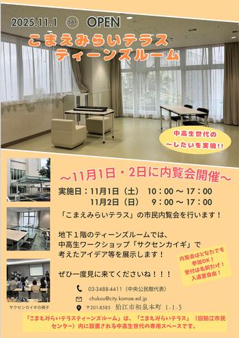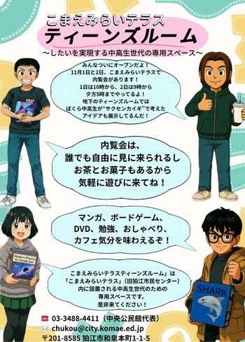 こまえみらいテラスの地下1階に中高生専用の居場所「ティーンズルーム」がオープンします。