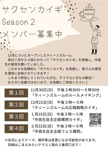 令和7年7月から4回にわたって「サクセンカイギseason1」を実施し、中高生の意見と、それを支える大学生サポーターの関わりにより、ティーンズルームに期待すること、レイアウトや設置する備品などを考えました。オープン後の11月からは、「サクセンカイギseason2」を実施し、利用してみて思ったことや、利用にあたってのルールづくりなどを話し合っています。